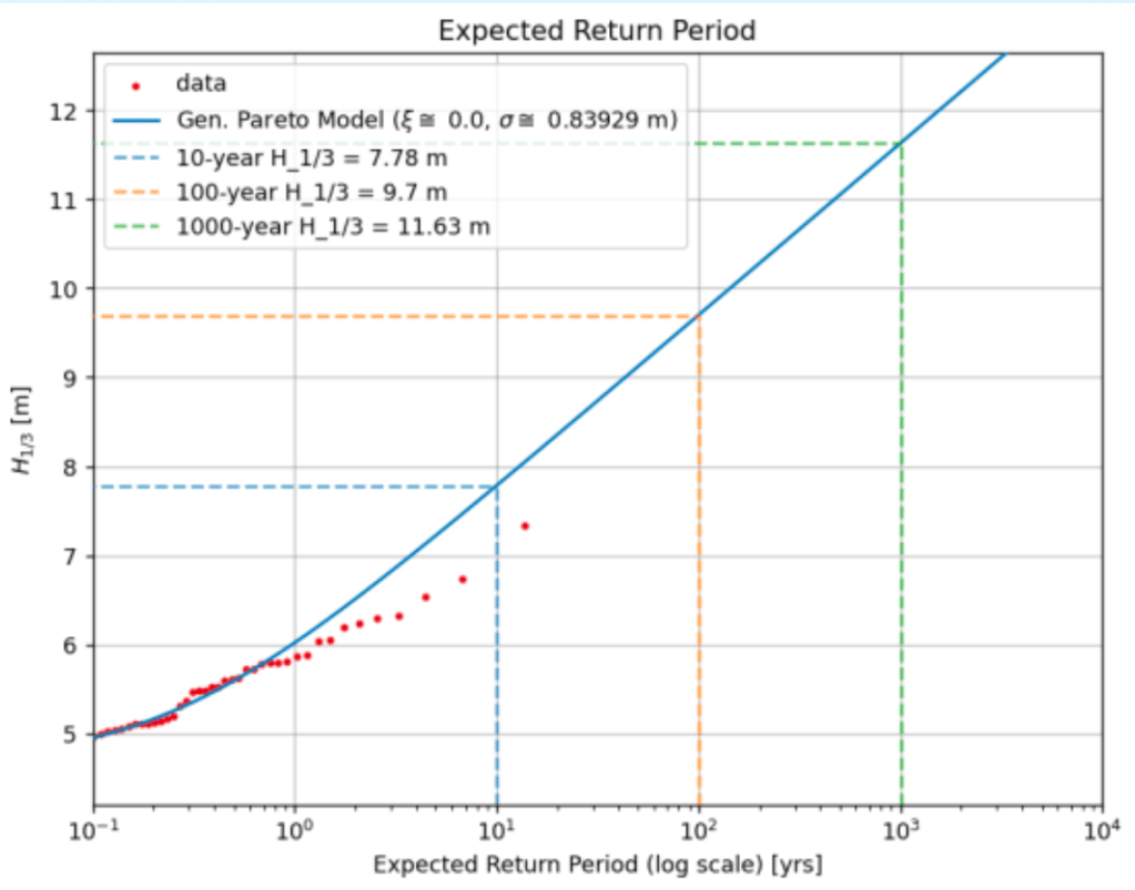 This project involved the determination of 100 year storm levels in a desired location, and a survivability simulation of a mooring during this storm.