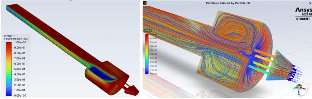 Working with the UVic Rocketry Team, I conducted this CFD simulation using Ansys Fluent. This analysis investigated different liquid oxidizer injector configurations to supply N2O to the combustion chamber.